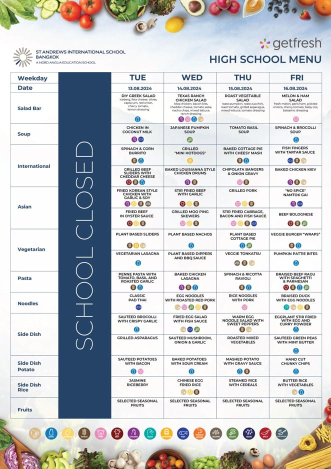 Our Primary School and High School canteen is run by getfresh, which provides catering services to many international schools in Bangkok. Our kitchen staff take real pride in creating healthy and appetising meals, which are freshly prepared each day. We offer a vegetarian option for lunch each day as well as a well-stocked salad bar and fresh fruit. We always ensure that meals are varied, nutritious and suitable for all stages of development.
