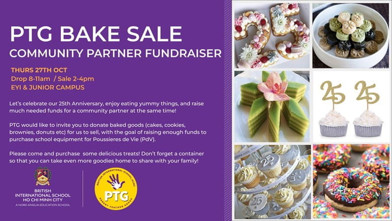 Để tham gia chương trình gây quỹ, phụ huynh vui lòng mua hoặc tự làm các loại bánh như bánh bông lan, bánh quy, bánh hạnh nhân, bánh khoai mì, bánh da lợn…, và gửi đến trường BIS, Cơ sở EYIC hoặc Junior trong khung giờ từ 8 giờ đến 11 giờ, thứ năm ngày 27 tháng 10. Chương trình bán bánh sẽ diễn ra cùng ngày, trong giờ các em tan học. Phụ huynh có thể trang trí bánh theo chủ đề kỷ niệm 25 năm ngày thành lập trường BIS.