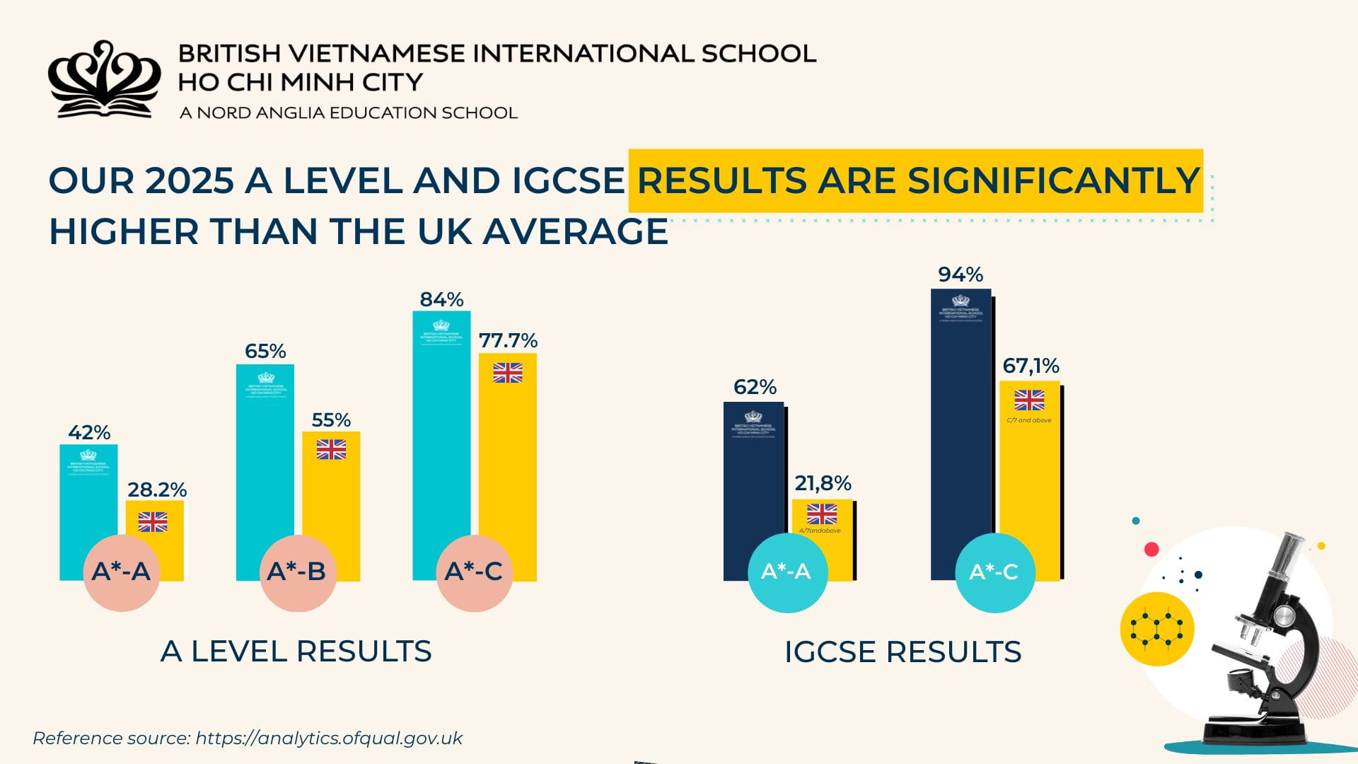 Over the years, BVIS students’ results in the International GCSE and A Level examinations have consistently exceeded the averages in the UK, based on Ofqual statistics. Specifically, 62% of BVIS students’ IGCSE grades were A*–A, compared with the UK average of 21.8%; for A Levels, the A*–A rate reached 42%, while the UK average was 28.2%