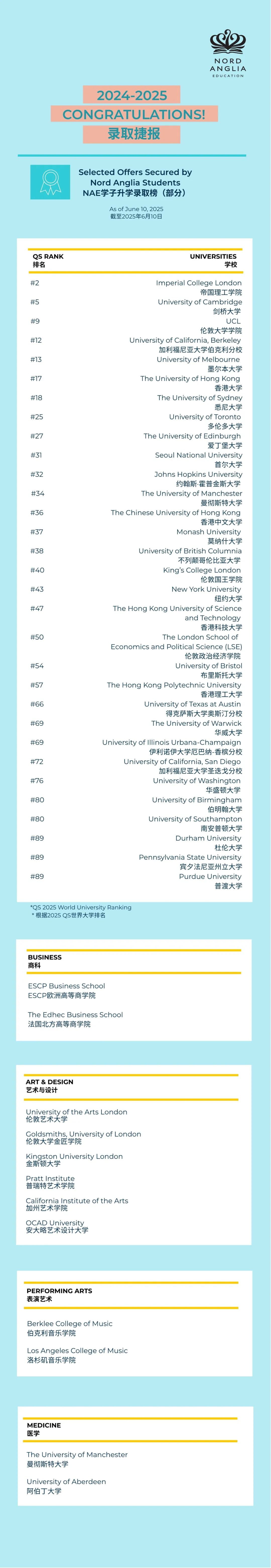 We are proud to celebrate the remarkable university offers received by the graduating Class of 2025 from the China International Schools of Nord Anglia Education. Our students have been accepted into some of the world’s most prestigious universities, including institutions ranked in the global top 10 and top 50, and top 100 of the 2025 QS World University Rankings.