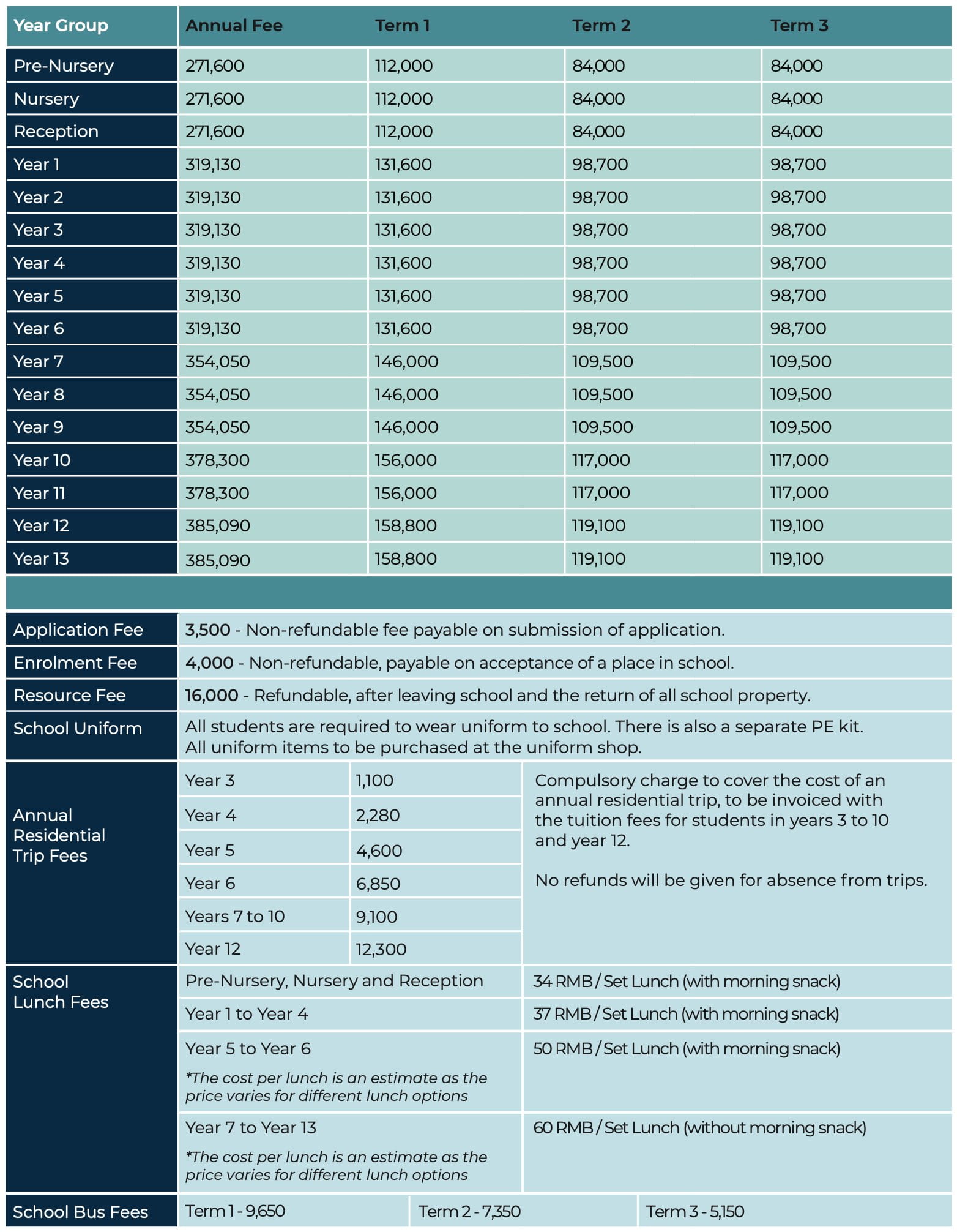 我们的国际学校学费以人民币计算,按每位学生收取。
