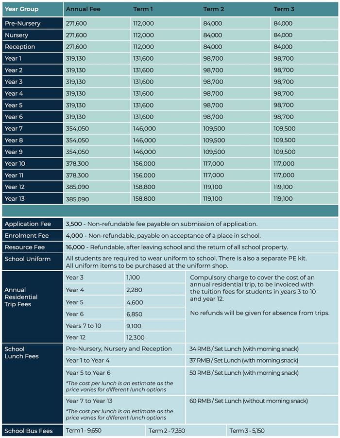 10至11年级的学费包含IGCSE考试费用,12至13年级的学费包含国际文凭(IB)评估费用。